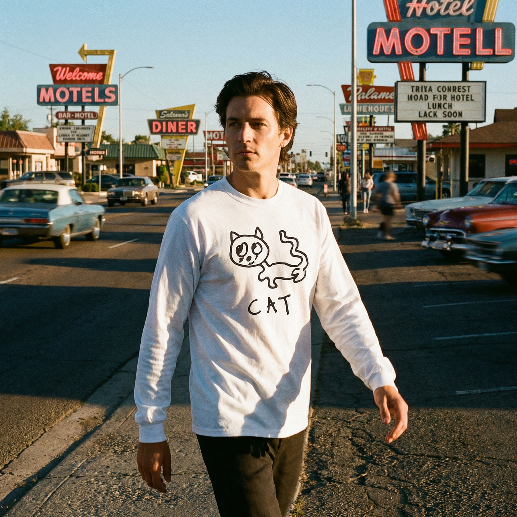 Our Cat Long Sleeve Tee features a hand-drawn minimalist cat printed on soft cotton with a relaxed fit that’s comfortable, breathable, and easy to wear year-round. The design is simple, quietly judgmental, and exactly what it needs to be. Perfect for cat lovers or anyone who prefers their shirts low-effort and slightly superior. Available in multiple sizes.