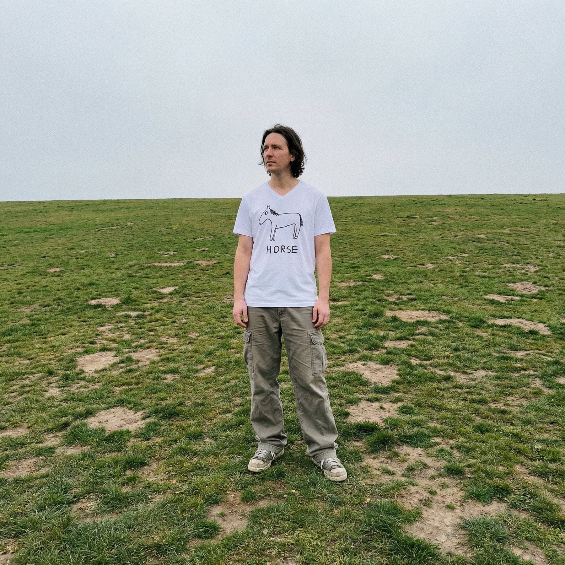 Model in horse v-neck tee in a wide rolling field, distant treeline behind them