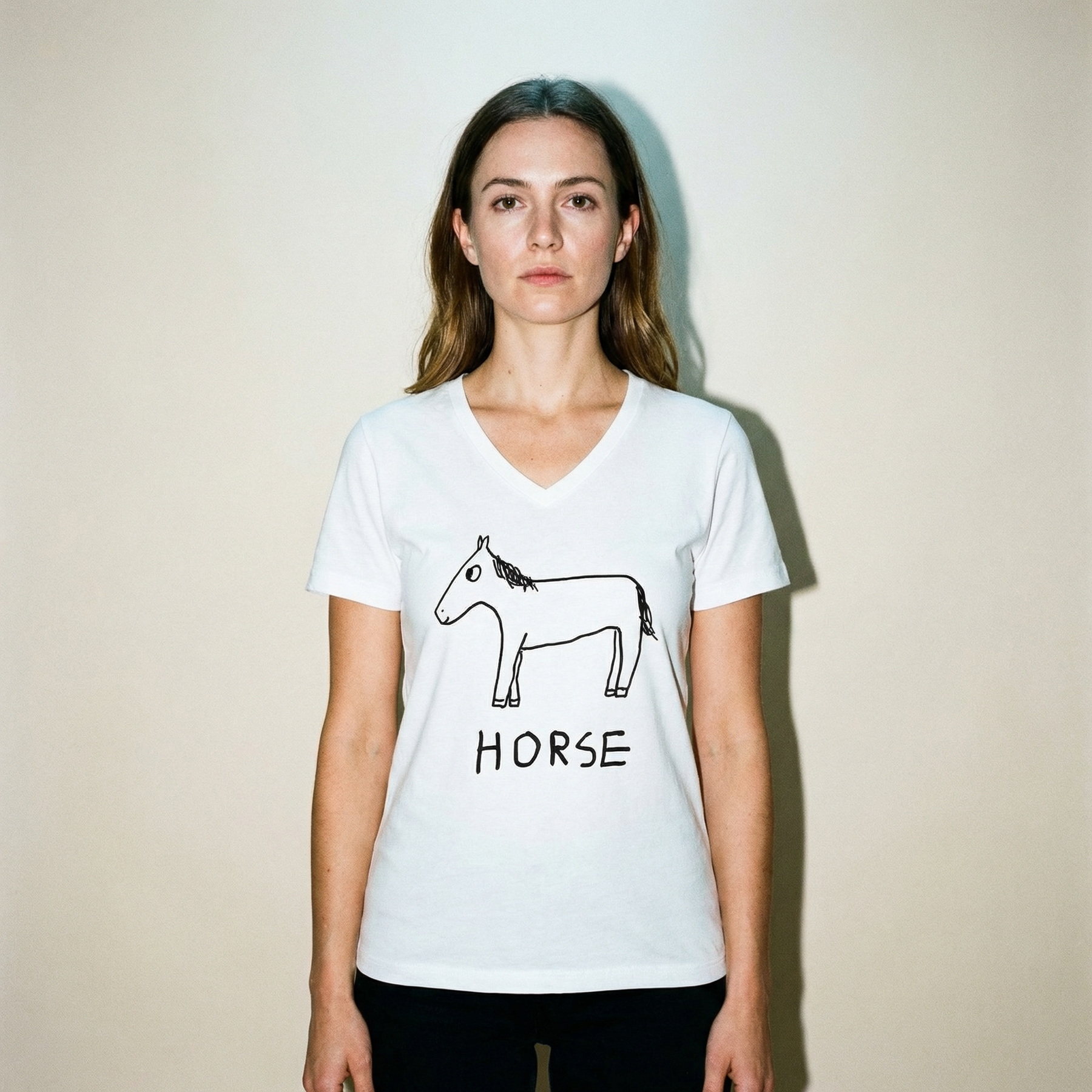 Model wearing the horse v-neck tee, upright posture, pale studio backdrop
