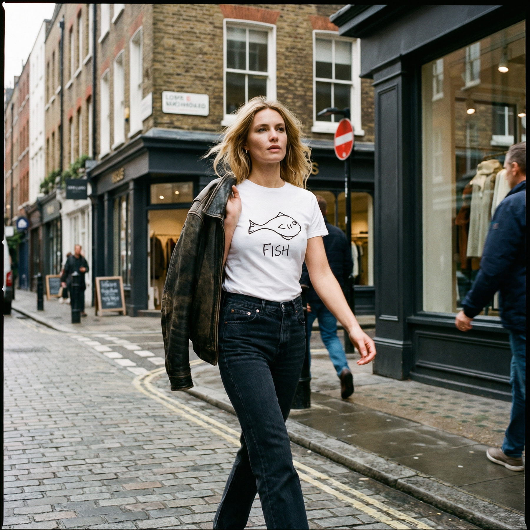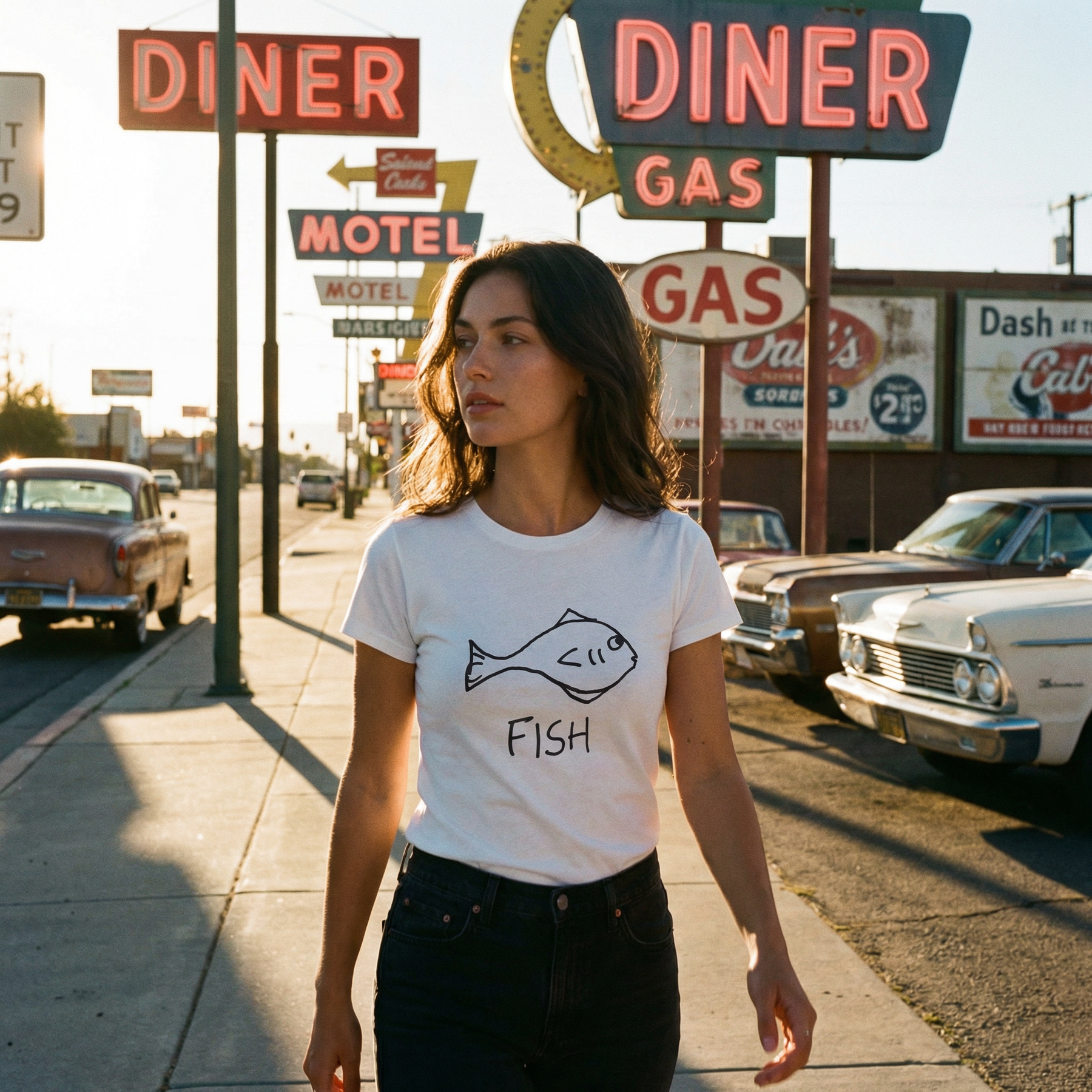 Fish graphic fitted tee worn on city street – lofi animal shirt style