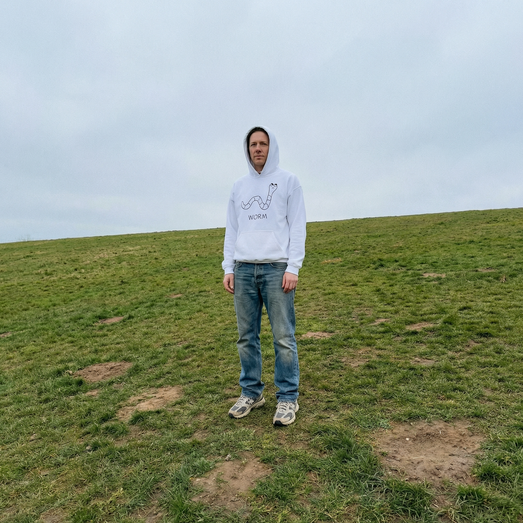 Worm hoodie worn outdoors – minimalist lofi worm hoodie in natural setting