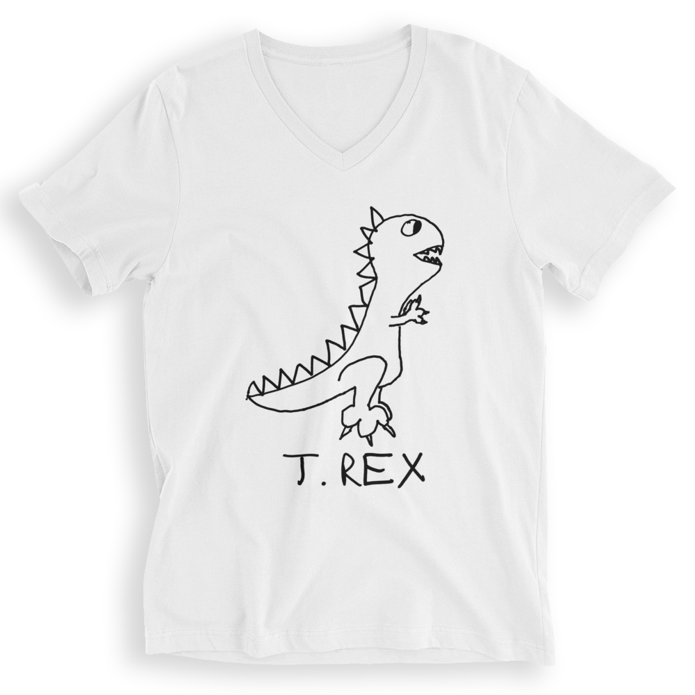 White v-neck t-shirt with a lo-fi hand-drawn T.Rex dinosaur graphic and &